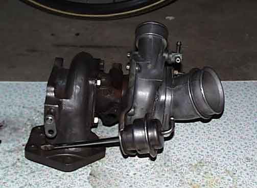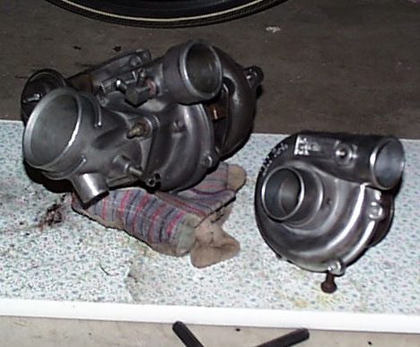 I called around to a bunch of places to get some prices. . .they all averaged around $300-a lot better than $800!!! Then I did a search on Ebay and found them pretty darn cheap. I got 3 turbos in excelent shape-all for less than $150 each. One of the turbos that I got was from the Ford T-bird Turbocoupe, I discovered that it has a larger compressor wheel (.48 trim)--WhooHoo! The Ford Turbo was capable of 381CFM whereas the stock RS turbo is only capable or 200CFM. I disassembled the Turbine housing from the turbo, then took my housing and bolted it right on. . .it was a perfect fit. No machining needed!